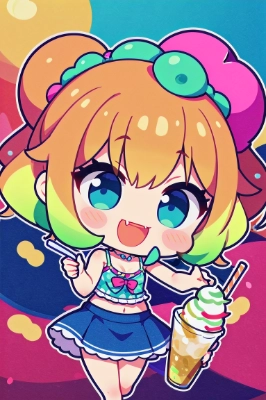 little girl, camisole, skirt, soft serve ice cream, perfect anatomy, masterpiece, absurdres, best quality, intricate details, best quality, 8k, best aethetic, beautiful art, ultra-detailed, illustration, ((kawaii)), cute, smile, open mouth, fang, multicolored hair, day, summer, Two heads high