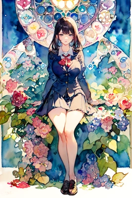 masterpiece, best quality, extremely detailed, (brushwork of Alfons Mucha, Art nouveau:1.3), (oil painting, shading, blurring, Golden hour:1.4), (a pure and lustful schoolgirl:1.6), black eyes, black hair, school blazer uniform, rosebuds, big breasts, bare legs, sleeping, close up shot,