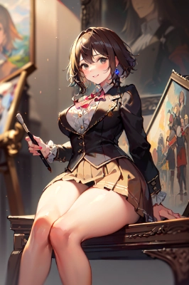 masterpiece, best quality, extremely detailed, (Mucha style, Art nouveau:1.3), (watercolor painting, shading, blurring, Dramatic lighting:1.4), (a pure and lustful schoolgirl:1.6), black eyes, black hair, school blazer uniform, rosebuds, big breasts, bare legs,