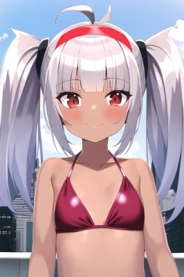 「街中でビキニ」のつもりでしたが、プールみたいな背景が付いてきました。 ビル街の中にある屋外プールでの感じに。