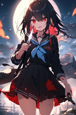 (extraordinary, best beauty, new, best quality, ultra-detailed 1.0, highly detailed, detailed background, best quality, highly detailed) 16 years old, female, yandere, medium hair, bangs over one eye, black hair, black sailor suit, red eyes, ruthless, bloody hands and bloody clothes, (holds a bloody knife), (stands up and points a knife at someone standing ), (despairing expression), (red full moon), (school road late at night).