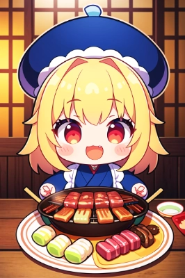 little girl, Japanese barbecue, yakiniku, Yakiniku restaurant, Grill, tong, drink, perfect anatomy, masterpiece, absurdres, best quality, intricate details, best quality, 8k, best aethetic, beautiful art, ultra-detailed, illustration, ((kawaii)), cute, smile, open mouth, solo, Twoheadshigh,