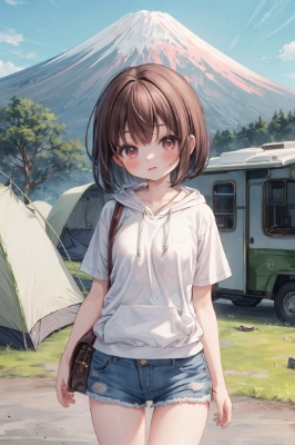 <lora:KARIN-v1:0.5>, masterpiece, best quality, ultra detailed, very cute and beautiful girl, short stature, round face, slanted maroon eyes, long eyelashes, pinky lip, dark brown short hair, bob cut, small breasts, thigh gap, solo, short sleeve hoodie, denim shorts, in camp site, barbecue plate, barbecue grill, smoke, sunset, smile,