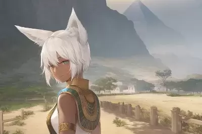 aura effect, magic aura, (masterpiece)+, (hyperrealistic)++, (novel illustration)++, (solo)++, (brave female)+, (dark-skinned girl)+, (white hair)++, short hair, (simple Egyptian clothes)++, (detailed face)+, (beautiful detailed eyes)++, small chest, sharp eyes, (fox ears)+, straight arms, arms down,