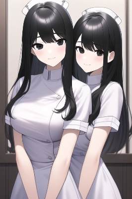 masterpiece, best quality, {{{highly detailed}}}, {{{high resolution}}}, {{{novel illustration}}}, medium breasts, yellow Nurse uniform, Yellow Nurse Hat, 2girls, twins, long hair, yellow hair, Yellow Eyes, same, Smile, dual persona, looking to the side,