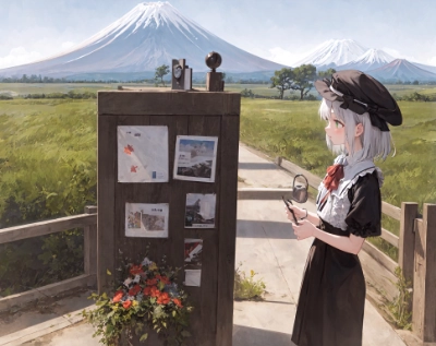 1girl, (mount fuji:1.2), scenery, black dress, white hair, green eyes, medium hair, solo, (flat chest:0.9), wide shot, long skirt,, (masterpiece:1.4),best quality,high quality,hyper quality,highres,ultra detailed,very_high_resolution,large_filesize,full color