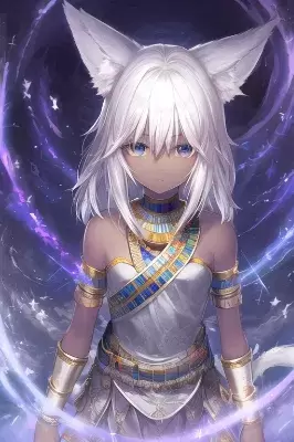 straight sword, sword in front, open stance, (masterpiece)+, (hyperrealistic)++, (novel illustration)++, (solo)++, (brave female)+, (dark-skinned girl)+, (white hair)++, short hair, (simple Egyptian clothes)++, (detailed face)+, (beautiful detailed eyes)++, small chest, sharp red eyes, (fox ears)+,