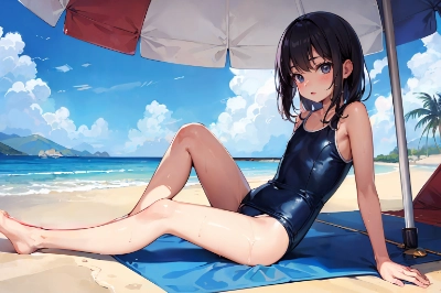 very cute female child,10 yo,black hair,flat chest,hime cut,frilled bikini,standing,ass,beach,from behind, from below,