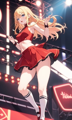 masterpiece, best quality, extremely detailed, anime, solo, 1girl, mini skirt, pink dress, hirahira, frill, stomach, ((black knee high)), garter belt, mike, stage, idle, blonde hair, long hair, blue eyes, neon, kirakira, embarrassed, cute, kawaii, bright