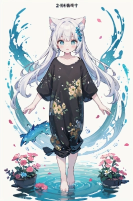 Beautiful cat-eared girl eating breakfast in a cafe. 18-year-old. white dress. Medium length black hair. She has a beautiful profile. Outside the window, the sea stretches out and small houses with white walls are lined up. Images that look like photographs, detailed illustrations. cinematic lighting.,