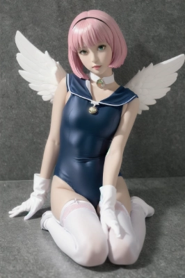 Plastic figure, best quality, ultra detailed, realistic, masterpiece, best_quality, immaculate_detail, manabe_rika, 1girl, halo, white one-piece swimsuit, solo, thigh boots, one-piece swimsuit, swimsuit, pink thighhighs, thighhighs, school swimsuit, blue hair, blush, angel, gloves, boots, wings, elbow gloves, pink footwear, short hair, magical girl, green eyes, breasts, gem, brooch, bangs, sailor collar, swimsuit under clothes, angel Magical Clothes, magical girl, sailor collar, crop top, one- piece swimsuit, pink footwear, elbow gloves,,,,