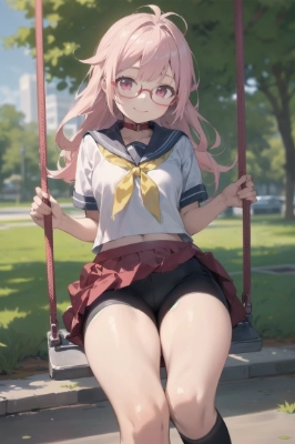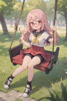 masterpiece, best quality, extremely detailed, anime, (1 lady), 14 years old, from above, smile face, round eyes, small breasts, thin body, small hip, thin thighs,(((long pink messy hair))), (red Wellington glasses) , pink eyes, (white:1.2 short sleeve:1.2 sailor suit), white breast cloth, {school uniform red collar}, {school uniform yellow ribbon}, {long red flared skirts}, put on (short black bike shorts), 1 plate wooden swing, 2 rope swing, rectangular seat swing, get on the swing in the park, (put on black leg wear), put on white sneaker, holding swing rope with both hands,,