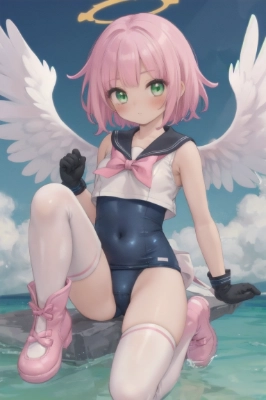 Plastic figure, best quality, ultra detailed, realistic, masterpiece, best_quality, immaculate_detail, manabe_rika, 1girl, halo, white one-piece swimsuit, solo, thigh boots, one-piece swimsuit, swimsuit, pink thighhighs, thighhighs, school swimsuit, blue hair, blush, angel, gloves, boots, wings, elbow gloves, pink footwear, short hair, magical girl, green eyes, breasts, gem, brooch, bangs, sailor collar, swimsuit under clothes, angel Magical Clothes, magical girl, sailor collar, crop top, one- piece swimsuit, pink footwear, elbow gloves, nipple, torn clothes,
