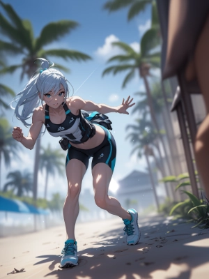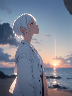 (blurry background:1.3), (extremely detailed fine touch:1.3), ///, girl, black short hair, white bikini, swimsuit, mixed media, diverse materials, unexpected combinations, creative exploration, flower, blue sky, horizon, white cloud, reflection, ruins