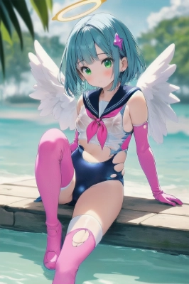 Plastic figure, best quality, ultra detailed, realistic, masterpiece, best_quality, immaculate_detail, manabe_rika, 1girl, halo, white one-piece swimsuit, solo, thigh boots, one-piece swimsuit, swimsuit, pink thighhighs, thighhighs, school swimsuit, blue hair, blush, angel, gloves, boots, wings, elbow gloves, pink footwear, short hair, magical girl, green eyes, breasts, gem, brooch, bangs, sailor collar, swimsuit under clothes, angel Magical Clothes, magical girl, sailor collar, crop top, one- piece swimsuit, pink footwear, elbow gloves, nipple, torn clothes, see-through swimwear, erect nipples, large breasts, exposed nipples pink nipples, bare nipples,