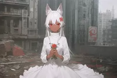 tentacles, sun shine, underwater, (masterpiece, best quality)++, brave female, flower, simple turtleneck t-shirt, solo, dark-skinned girl, frills, fox ears, white dress, white hair, detailed face, detailed eyes, sharp red eyes,small chest, looking away, ruined city, destroyed buildings, salt,