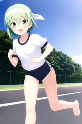 masterpiece, best quality, A cute girl, dark-green eyes, {dark blue buruma}, high-waisted buruma, low-leg, gym uniform, flat chest, white green hair, short hair, {{white hachimaki}}, white headband, barefoot, running pose, in schoolyard, at clear sky
