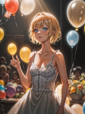 (blurry background:1.6), (extremely detailed fine touch:1.3), (hard light, studio light, light rays, dappled light, reflection, shadows, ray tracing:1.0), ///, girl, light blonde short hair, chignon, braided, (flower print white dress:1.3), flower garden, sea, beach, tree, blue sky, cloud, (brick:1.3), (reflection:1.3)