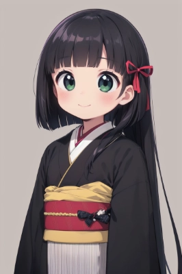 (((very longest hair))),black hair, smile, (((Long Hair))),straight Hair,hair ribbon,mintgreen stripe,Black Eyes,flat chest,straight Across bangs,princess Cut, Very Long Sideburn,roundry Head,Droping eyes,1 Girl,cute,Meekness,Bob Cut,long back hair,12 years Old,Kimono,japanese Cloth,