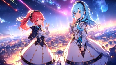 2girl,(best quality:1.2),(ultra Details extremely scrutiny photographic three-dimensional background:1.2),(ultraDetails extremely scrutiny Characters drawn like figures:1.8),8k,(anime texture paint taste:1.4),(cute young maiden girl:1.2),with cute Healthy makeup,(gradation light wine red hair:1.1),(gradation light blue hair:1.1),waving in the breeze ponytail hair,embroidery cape wear,gradation clear vivid glitter pupil eyes,prairie skirt,small mouth,dignified face,Huge panorama view,fantastic romantic world ,Gainsborough hairband,dynamic action,sad,battlefield,city,burned ruins,arms,heavy weapons,(sense of reality with vfx effects:1.4),(flame sfx with effects:1.4),(with CGI effects:1.4),(with special effects:1.5),<lora:add_detail:0.2> <lora:sharpen-soften:0.1>