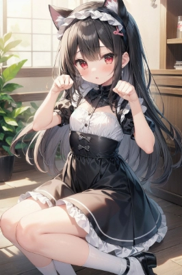 1girl, ((masterpiece)), ((best quality)), (ultra-detailed), ((kawaii)), (lovely),game cg,16years old,(droppy dog ear:1.3),black eyes,pink hair,bobcut,pajama:1.3,Frilled headband,blush,wariza, hands between legs,