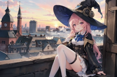 masterpiece, best quality, extremely detailed, (steampunk:1.3), 1girl, solo, kawaii, 16yo, detailed corset vest, blue short pants, medium breasts, BREAKbeautiful detailed face and eyes, smile, blush, purple brown hair, short hair, single braid, blue flower hair ornaments, hair between eyes, blue eyes,BREAKharbor, (black steamship:1.2), sea, sunset, evening,