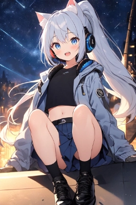 (Extraordinary, Best Beauty, New, Best Quality, Super Detailed 1.0, High Detailed, Detailed Background, Best Quality, High Detailed) Age: 16 years old, female, ponytail, blue-gray hair, light blue eyes, ( (gray jacket), (navel exposed), (black T-shirt), navy blue belted skirt, navy blue socks, (absolute area), thigh belt, black boots, headphones, cat ears, (flat chest), orange A bouquet of colored flowers is about to be handed over (near-future city, starry sky).,