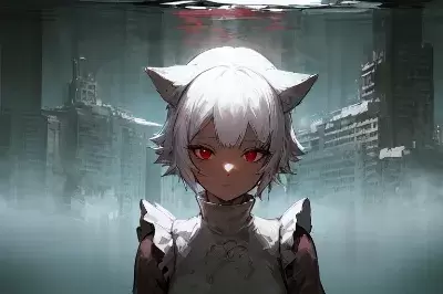 sea world, (masterpiece, best quality)++, brave female, (simple)+ turtleneck t-shirt, solo, dark-skinned girl, frills, fox ears, white dress, white hair, detailed face, detailed eyes, sharp red eyes,small chest, looking away,