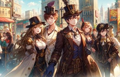 Masterpiece, high quality, super detailed, super high quality, very delicate and beautiful, girl, high school student, (((black hair two side up to waist))), eyes sharp and strong glossy glossy eyes, eyebrows glossy, eye color magenta, 6.5 head tall, knee socks, lace,Standing, (background city), ((steampunk)) ,