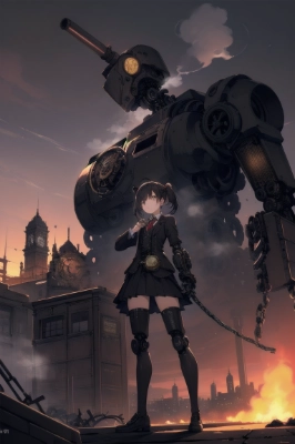 masterpiece, best quality, best quality drawn, (((steampunk))), an anime girl, (a girl in brown classical blazer and red tie), black skirt, (((robot arm))), girl with monocle, monocle, ((Gears everywhere)), brown top hat, gear blazer, (golden huge pocket watch and chain), baroque, ((many steam engine machines everywhere)), 19th century London cityscape, black hair, pigtails hair, slender body, (insanely detailed), thin steam, outdoors, A group of buildings lined up in a row, Twilight, Documentary, beautiful mechanics, karate punch, half body shot, moody lighting,