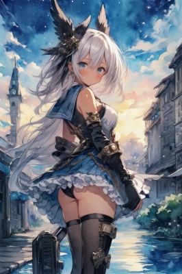 (steampunk,1 girl,watercolor,colorful,exceptional, best aesthetic, new, newest, best quality, masterpiece, extremely detailed, anime, waifu:1.2),wallpaper,multiple,gear,city,clock,starry sky,light,machine,<lora:hairdetailer:1>