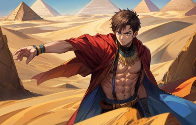 Masterpiece, high quality, super clear, super detailed, male handsome, mature, 30 years old, blue eyes, cool with suspended eyes, V-shaped eyebrows, body strong and fearless, 8.5 cm tall, (short gray hair, short cut to neck), (brown skin), slender nose, facial muscles, throat, dressed in national costume, intimidating, (background) desert),<lora:flat2:-0.4> <lora:hairdetailer:0.8>