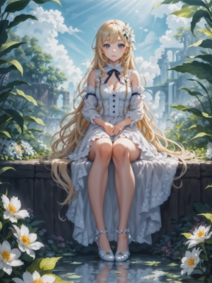 (kawaii background:1.3), (extremely detailed fine touch:1.3), (hard light, studio light, light rays, dappled light, reflection, shadows, ray tracing:1.0), ///, girl, long hair, light blonde, Princess, full body, sky, cloud, flower, glass shoes