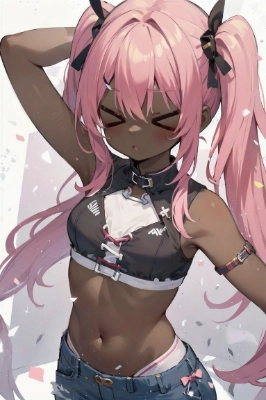 gyaru:1.5, pink hair, midriff, tan skin, lips, masterpiece, best quality, extremely detailed, anime, girl, sun flower, sky, summer, eat drink, red eyes, bracelet, tyndall effect, straw hat, ,<lora:kasshokuhada:0.4>