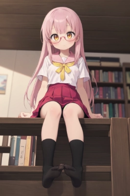 masterpiece, best quality, extremely detailed, anime, (1 girl), 14 years old, full body shot, ((from side)), (birds-eye view), looking straight at viewer, smiling, ((small breasts)), thin body, ((small hip)), thin thighs, (((long pink messy hair))), pink eyes, ((hair blowing in the wind)), (red Wellington glasses), sailor suit, ((short sleeve)), ((white sailor breast cloth)), (((white sneakers))), (((red sailor collar))), (long red flared skirt), (((yellow sailor ribbon))), ((((black socks)))), ((black school shoulder bag)), in the morning, walking on the street in front of houses, ,