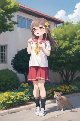 masterpiece, best quality, extremely detailed, anime, (1 girl), 14 years old, full body shot, ((from side)), (birds-eye view), ((very wide shot)), looking straight at viewer, smiling, ((small breasts)), thin body, ((small hip)), thin thighs, (((long pink messy hair))), ((hair blowing in the wind)), (red Wellington glasses) , brown eyes, sailor suit, ((short sleeve)), ((white sailor breast cloth)), (((red sailor collar))), (((yellow sailor ribbon))), (long red flared skirt), (((black))) socks, (((white))) sneakers, ((black school bag over the shoulder)), in the morning, walking straight down on the (sidewalk) in front of the fence , ,