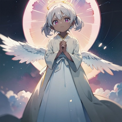 Style: (solo:2.0), (watercolor:1.4), (thick outline:1.4), cute, kawaii, Kyoto Animation, artist by Tetsuhiro KOSHITA, dandy.Character: pink eyes, (dark brown skin:1.8), (silver hair:1.4), (white eyebrows:1.4), (thick eyebrows, bushy eyebrows:1.4), pigtails, short hair, twintails, child, kid, infant, big eyes, round eyes, droopy eyes, tareme. Title: Cleaning Up.What they are looking at: A messy room.Facial expression: Determined.Pose: Bending down to pick up trash.Outfit: Casual clothes, possibly with an apron.Objects in the scene: Trash bags, broom, mop, dustpan, cleaning supplies.Effects: Rays of sunlight streaming through the window.Atmosphere: Productive and refreshing.Background: A cozy and cluttered living room.Composition: The character positioned in the center, surrounded by scattered objects to emphasize the cleaning task.,