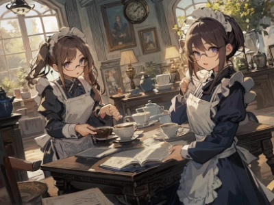 (masterpiece:1.1), (best quality:1.1), (high quality:1.1), (absurdres:1.4), (highres:1.4), (maid girls cleaning the room:1.4), (bloom:1.1), (duster:1.1), head_scarf BREAK multiple girls, maid, book, maid headdress, window, open mouth, indoors, twintails, long hair, apron, smile, maid apron, ribbon, holding, adjusting eyewear, purple eyes, blue eyes, short hair, chair, 4girls, dress, talking, long sleeves BREAK (house cleaning:1.4),