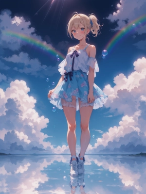 (blurry background:1.5), (extremely detailed fine touch:1.3), (hard light, studio light, light rays, dappled light, reflection, shadows, ray tracing:1.0), ///, girl, capture the serenity of a quiet coastline, with gentle waves, a lighthouse, and a calming atmosphere, eye to eye, eye contact, rainbow