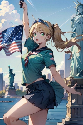 , New York City, girl, twintail, short sleeve, T shirt, mini skirt, blonde hair, green eyes, foreshortening, blue sky, dancing,((Statue of Liberty pose)),(((Statue of Liberty posing))), clothes of the American flag,(((Star-Spangled Banner Colored Clothes))) <lora:flatBG:0.4> <lora:lightline:0.65> ,