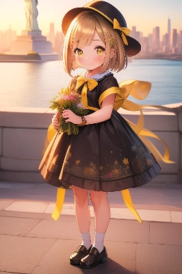 a girl is fortune teller,child,High detail blown hair,hair is bob,big yellow ribbon,High detail gold eyes,she is sitting on the chair,a orb and tarot cards on the table,in the Fortune telling hall