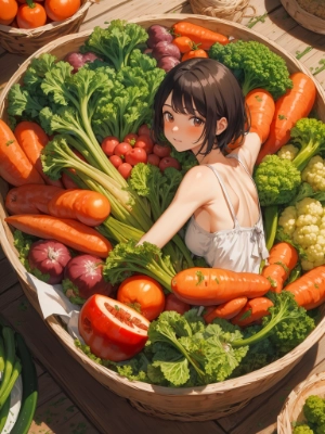 absurdres, highres, (extremely detailed fine touch:1.3), ///, (girl:1.3), short hair, (harvest festival:1.3), vegetables, Carrot, Tomato, Potato, Broccoli, Cucumber, Spinach, Bell pepper, Lettuce, Cauliflower, Onion, Eggplant, Zucchini, Kale, Radish, Celery, Green beans