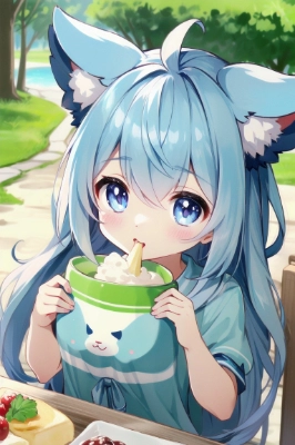 masterpiece, best quality, extremely detailed, anime, girl, skirt , girl, longhair, twintail, skirt, white hair, odd eyes, lolibitch, fantasy, colorful, cooking, cafe, eating, magical girl, magic, different world, playing <lora:hairdetailer:0.2> <lora:saturation:1> ,