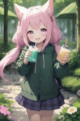 masterpiece, best quality, extremely detailed, anime, girl, skirt <lora:flat2:0> <lora:hairdetailer:1> , girl, braids, longhair, skirt, white hair, odd eyes, chibi character, fantasy, colorful, cat, flower, summer, happy, eating, sitting