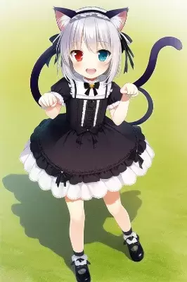 masterpiece, best quality, solo little girl, animal ear, animal tail, bob hair, green hair, {{{heterochromia}}}, full body, dynamic pose, smile, gothic dress, many flowers, wind effe
