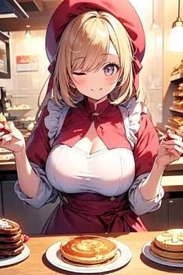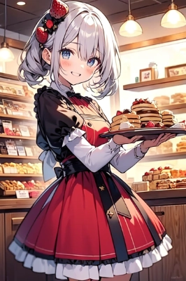 (masutepiece), (Best Quality), (hight resolution), (Ultra-detailed), beautiful detailed eyes, 8k, She is a pastry chef. She is a colorful sweets shop. The inside of the shop is cute and colorful. She is a very cute girl. Her smile captivates the people who see her. She wears cute and colorful costumes at the sweets shop. I\@!@m wearing a silver tray with pancakes topped with whipped cream and strawberries. Welcome! he says cheerfully, wearing a pastry chef\