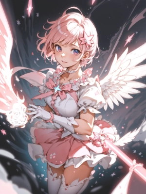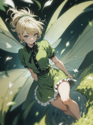 absurdres, highres, ultra detailed, (extremely detailed fine touch:1.3), ///, kawaii girl, light blonde short hair, ponytail, green dress, fairy wings, full body, slow motion, motion blur, (dynamic angles:1.3), strong wind, petal, from above