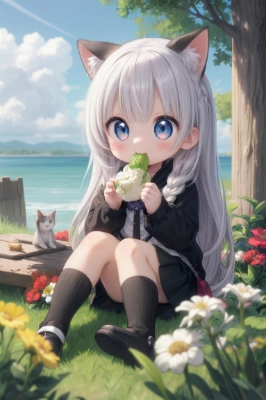 masterpiece, best quality, ultra-detailed, extremely detailed, 4K, 8K, best quality, beautiful, illustration, full body, colorful, gradation, full body focus, luxury bed, a cute girl, 1girl, solo, gothic lolita costume, beautiful black hair, beautiful brown eyes, beautiful eyes, white-skinned, long hair, cat ears, flowers, light smile, butterfly, twintail, cat, smiling,