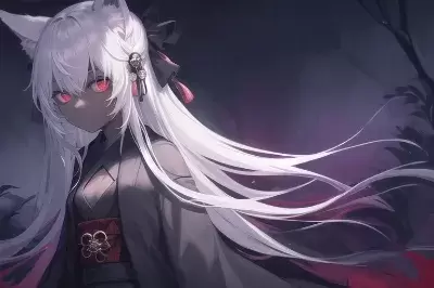 blue, green, yellow, (masterpiece, best quality)++, brave female, simple japanese kimono, solo, (dark-skinned)++ female, frills, fox ears, white dress, white hair, detailed face, detailed eyes, sharp eyes, mall chest, looking away,
