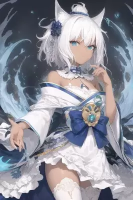 blue, green, yellow, (masterpiece, best quality)++, brave female, simple japanese kimono, solo, (dark-skinned)++ female, frills, fox ears, white dress, white hair, detailed face, detailed eyes, sharp eyes, mall chest, looking away,